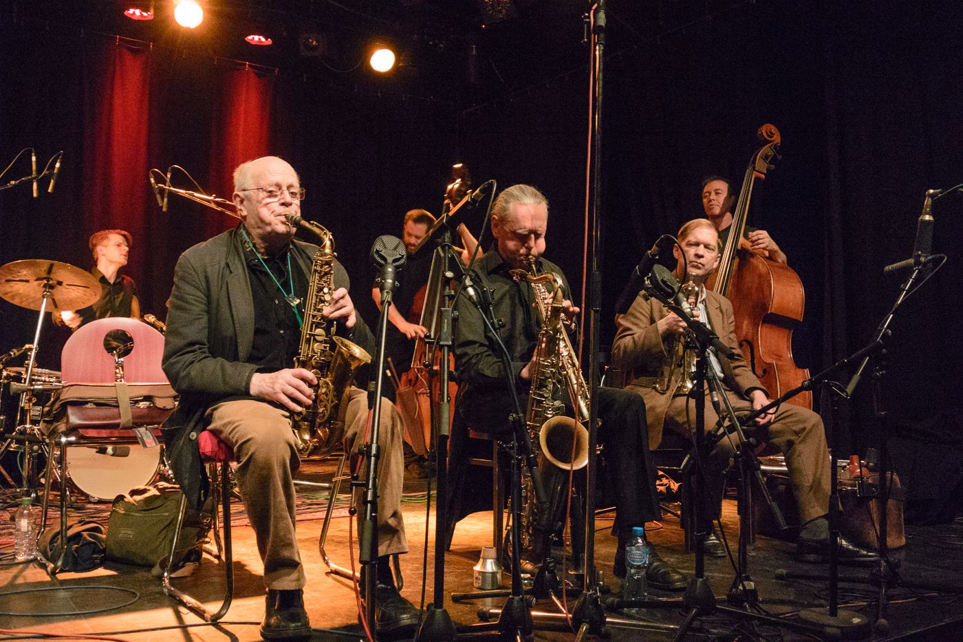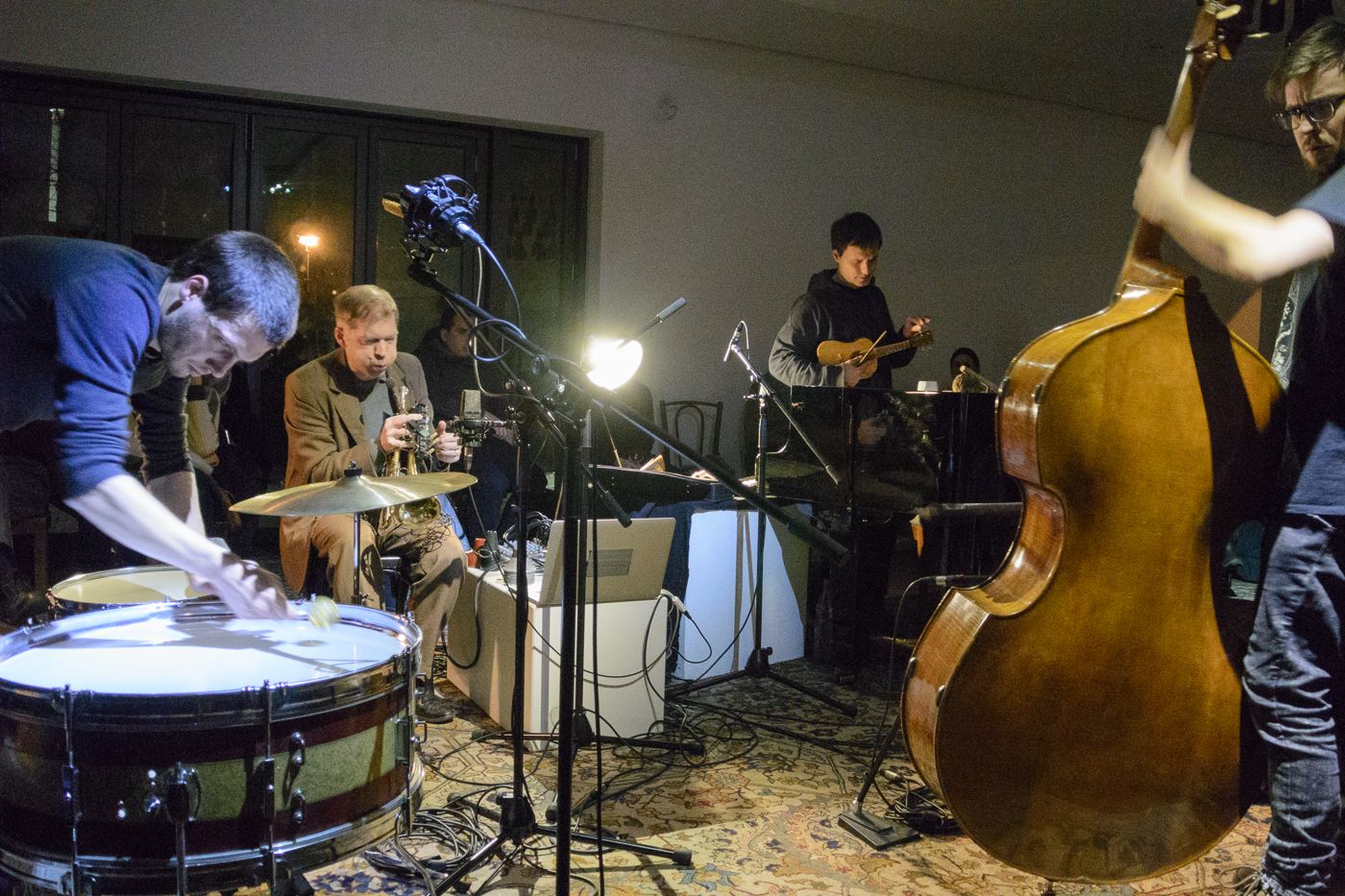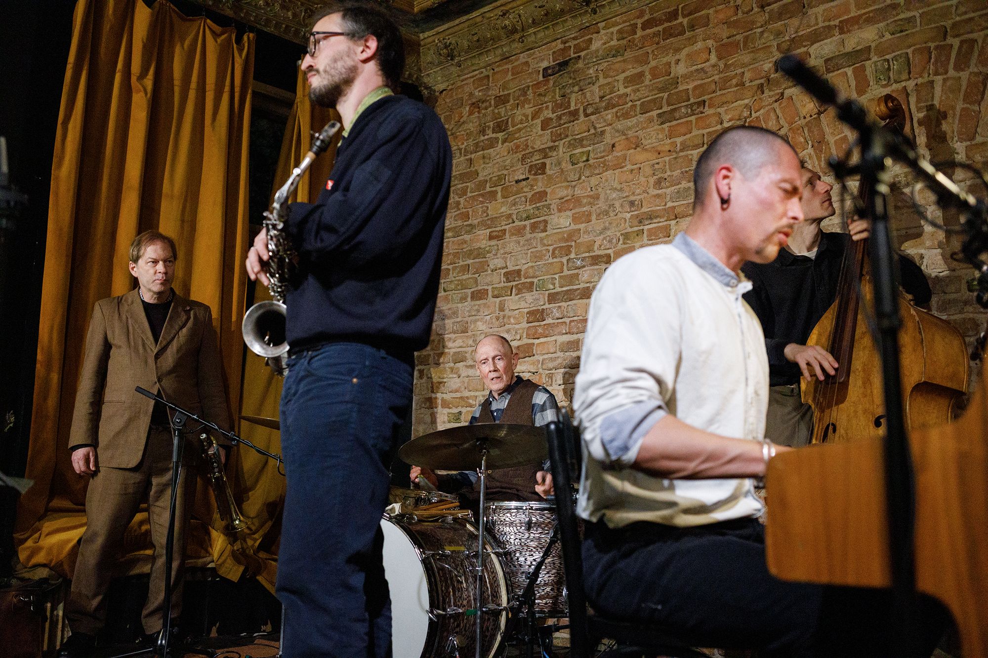 Christian Lillinger, Robert Landfermann, John Edwards, Axel Dörner, Urs Leimgruber, Ernst-Ludwig Petrowsky (also playing but not on the picture: Oliver Schwerdt) at die naTo, Leipzig, December 2015