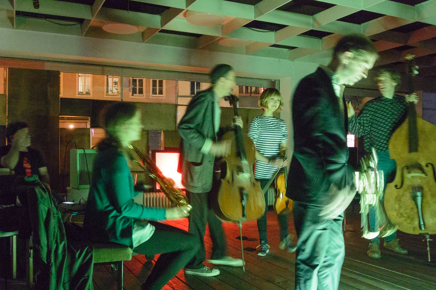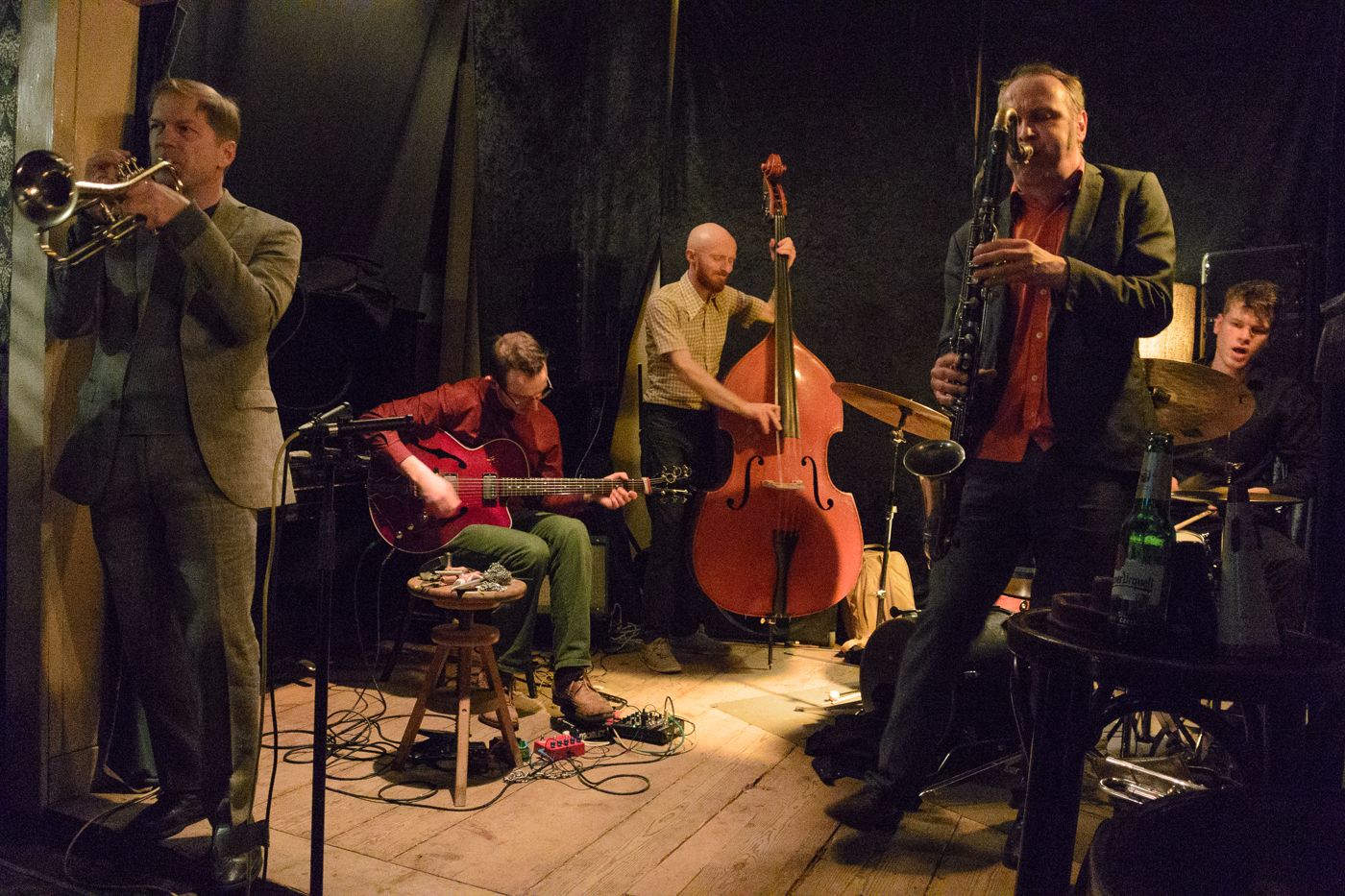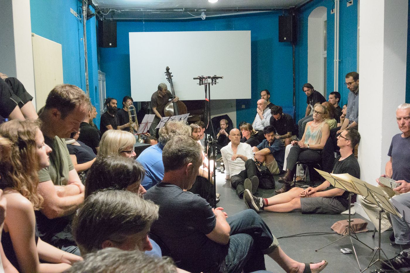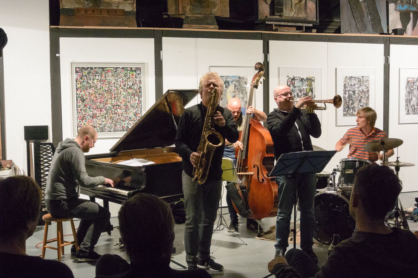 Christian Lillinger, Robert Landfermann, John Edwards, Axel Dörner, Urs Leimgruber, Ernst-Ludwig Petrowsky (also playing but not on the picture: Oliver Schwerdt) at die naTo, Leipzig, December 2015