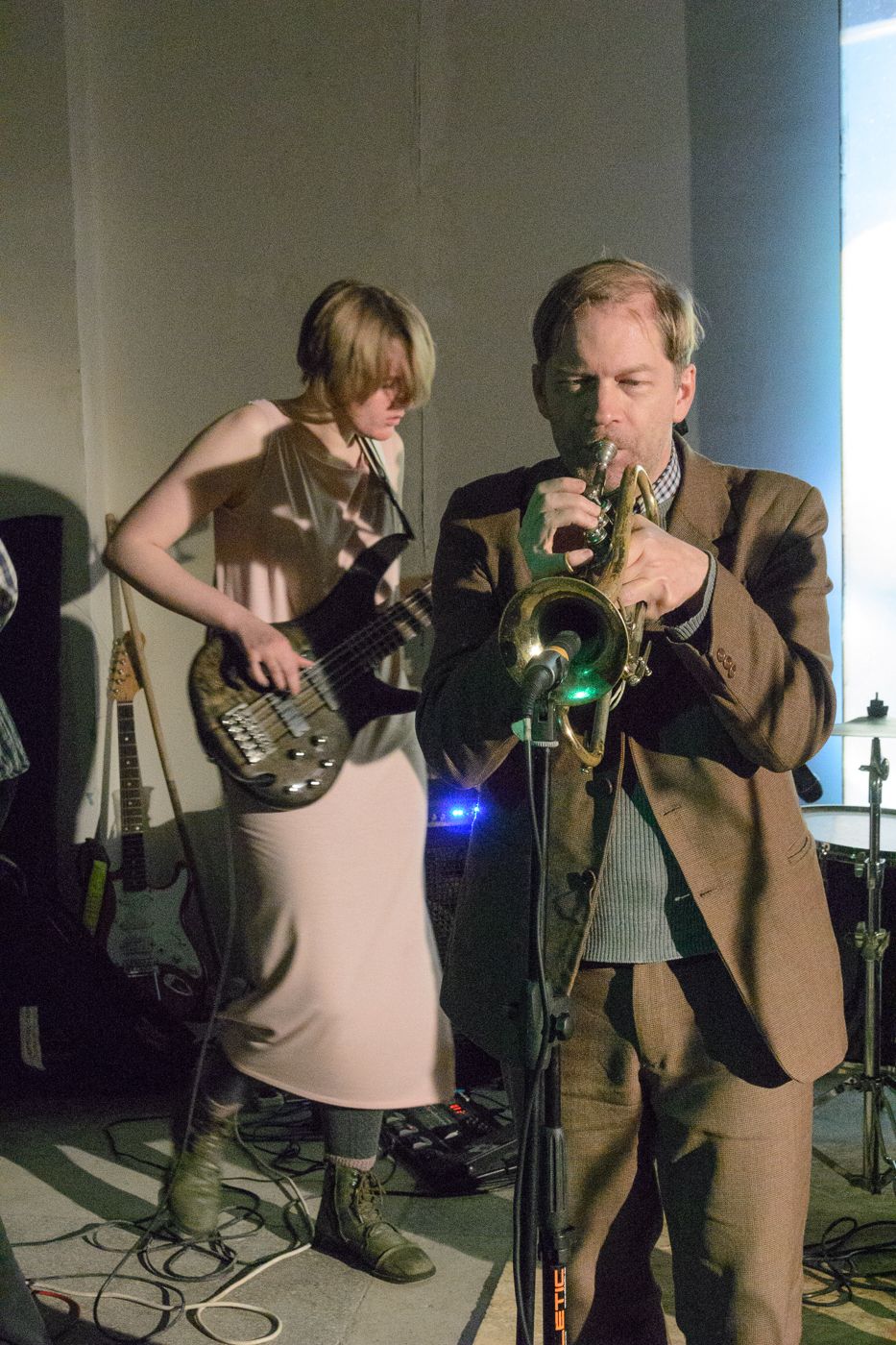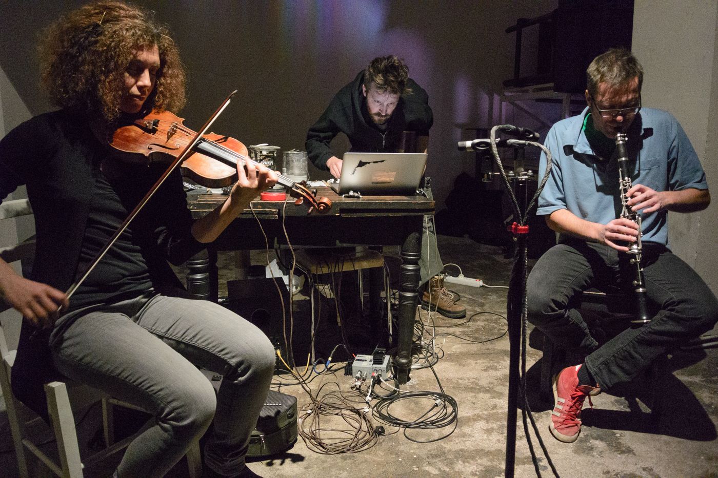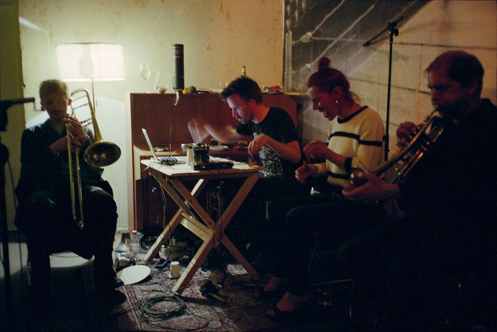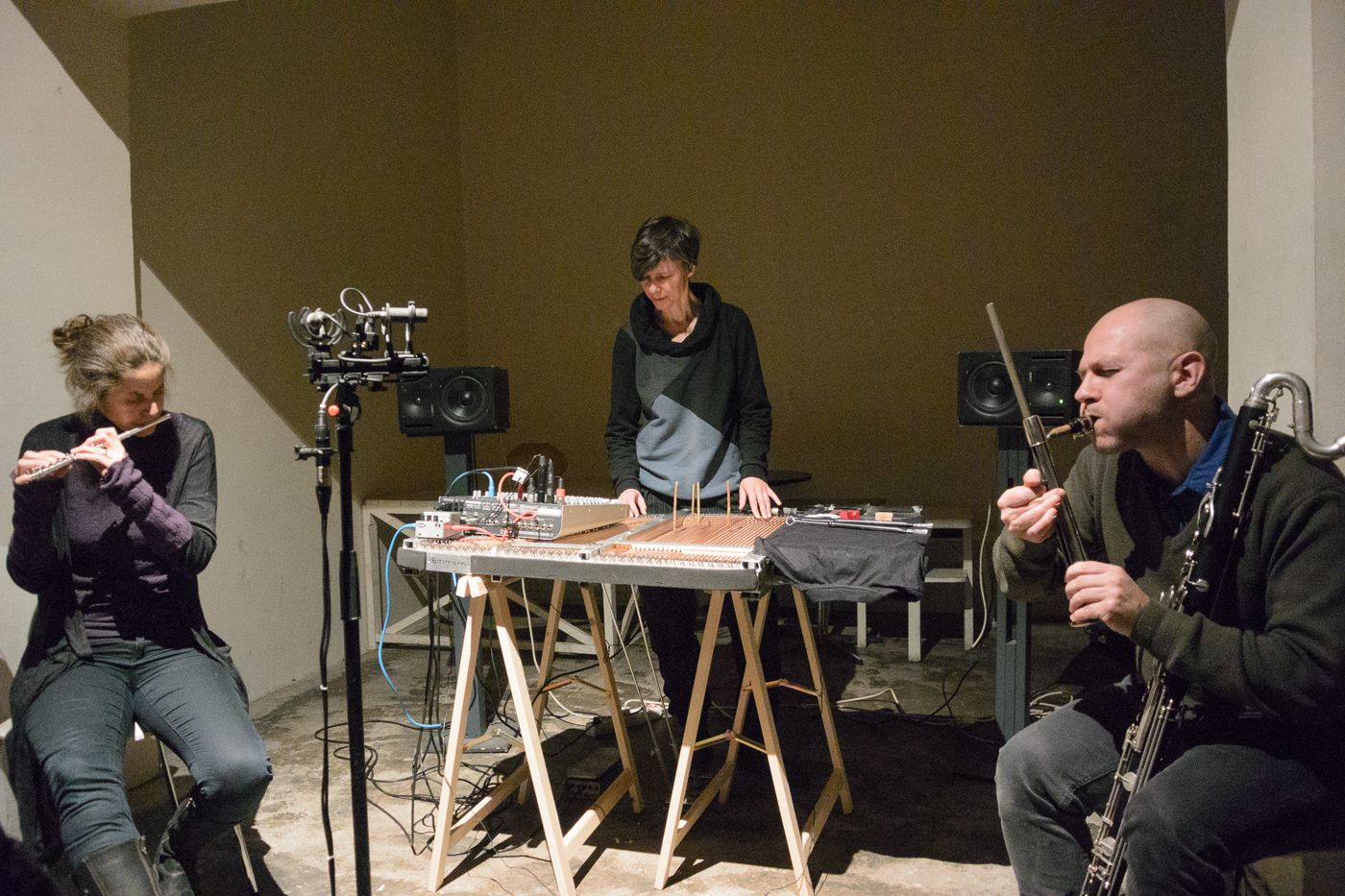 Schall und Rausch: Axel Dörner, Johan Arrias, Tisha Mukarji (also playing, but not on the photo: Kai Fagaschinski) at ausland, Berlin, on April 6th, 2014, while recording their album Vapour.
